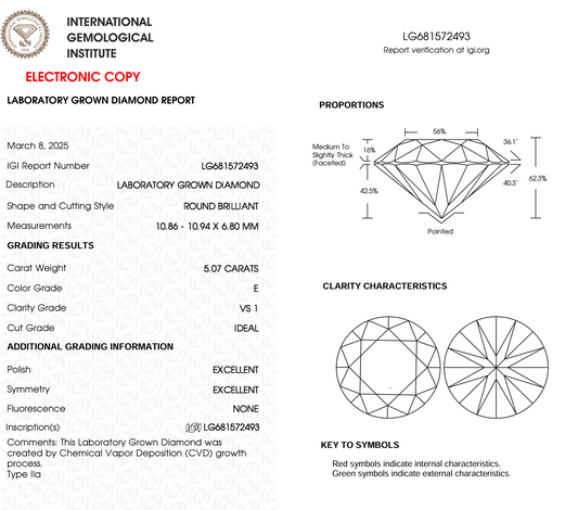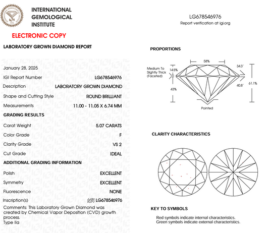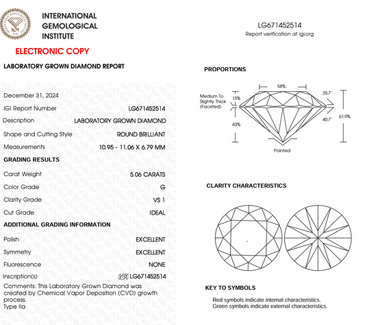 5.07 Ct Round Cut Lab Grown Diamond IGI Certification