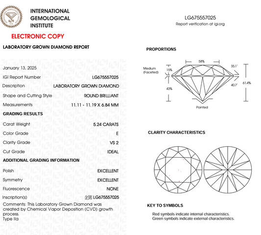 5.24ct Round Cut Lab Grown Diamond IGI Certified