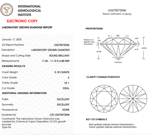 5.18ct Round Cut Lab Grown Diamond IGI Certified