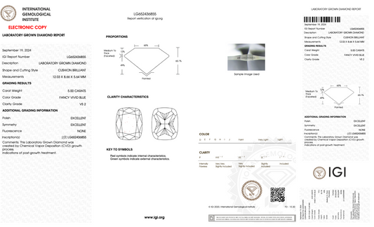 5 Carat Cushion Cut Fancy Vivid Blue Lab Grown Diamond | IGI Certified, VS Clarity, Diamond for Engagement Ring