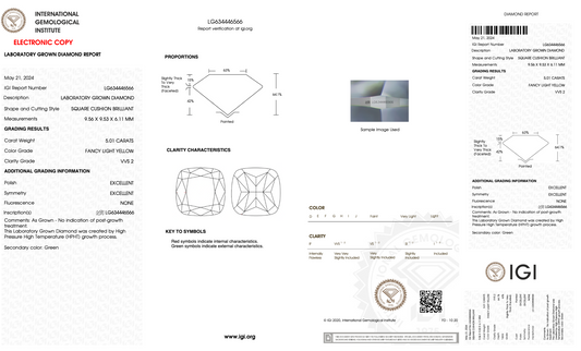 5 Carat Cushion Cut Fancy Light Yellow Lab Grown Diamond | IGI Certified, VVS2 Clarity, Ideal for Engagement Rings