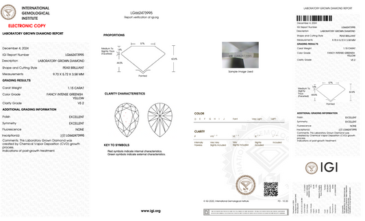 1.15 Carat Greenish Yellow Color Pear Cut IGI Certified Lab Grown Diamond
