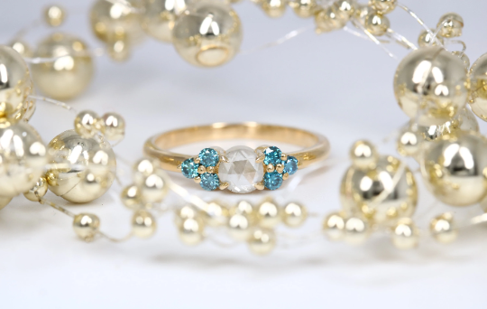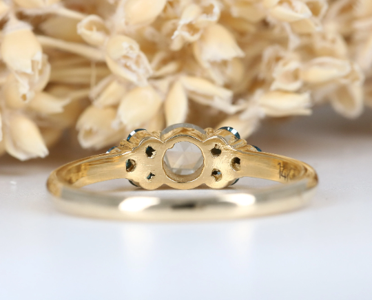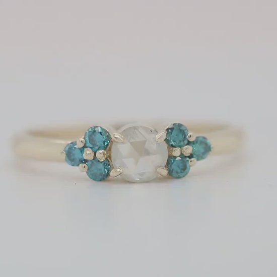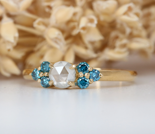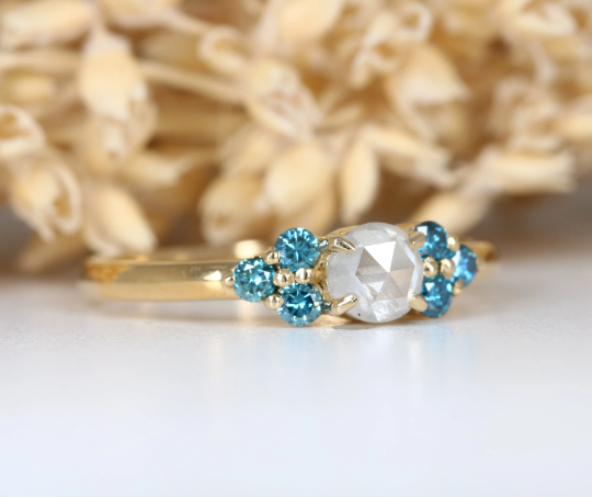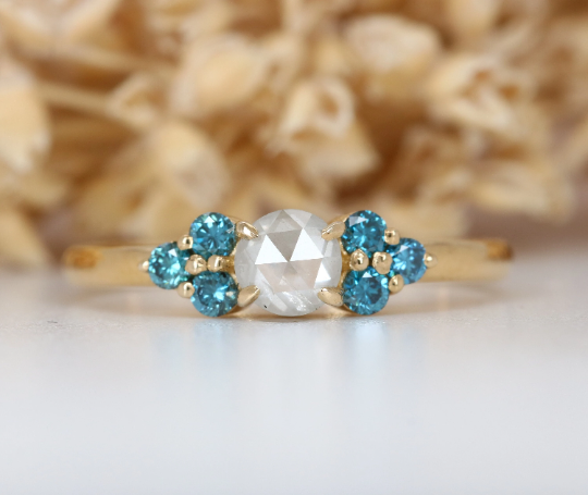 Blue SI Clarity Diamond Round Rose Cut 14K Yellow Gold Engagement Ring For Her