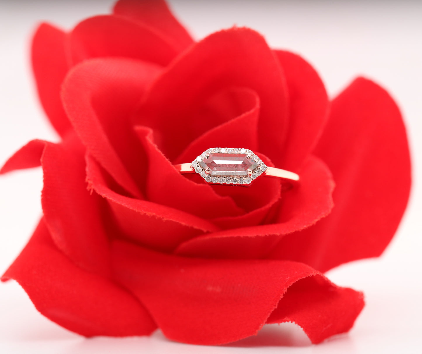 Elongated Hexagon Salt And Pepper Halo Rose Gold Diamond Ring