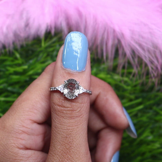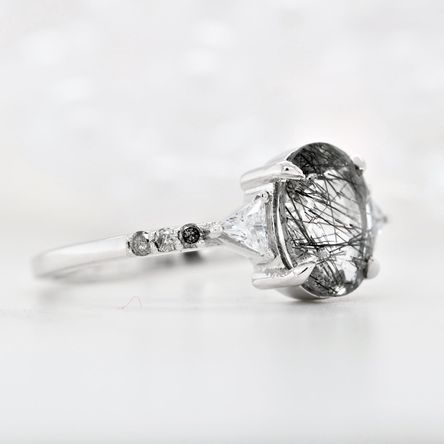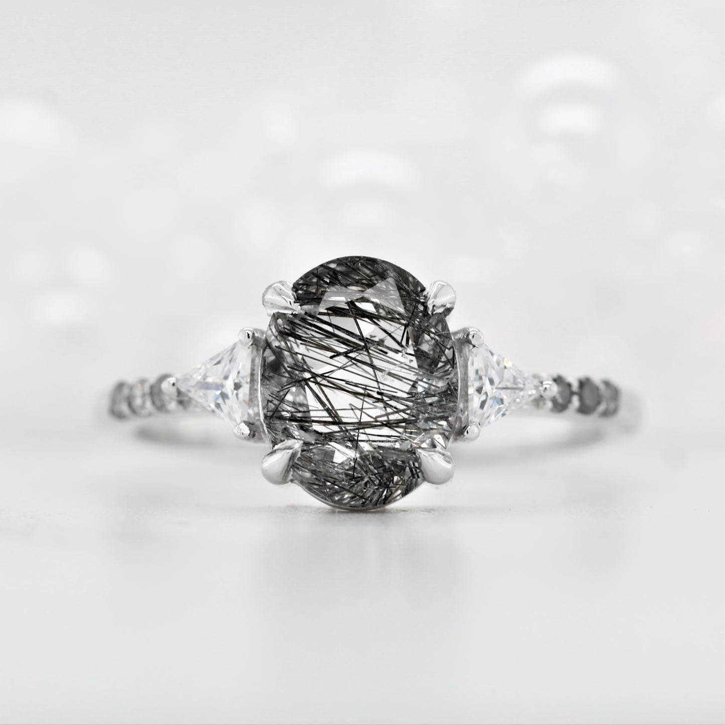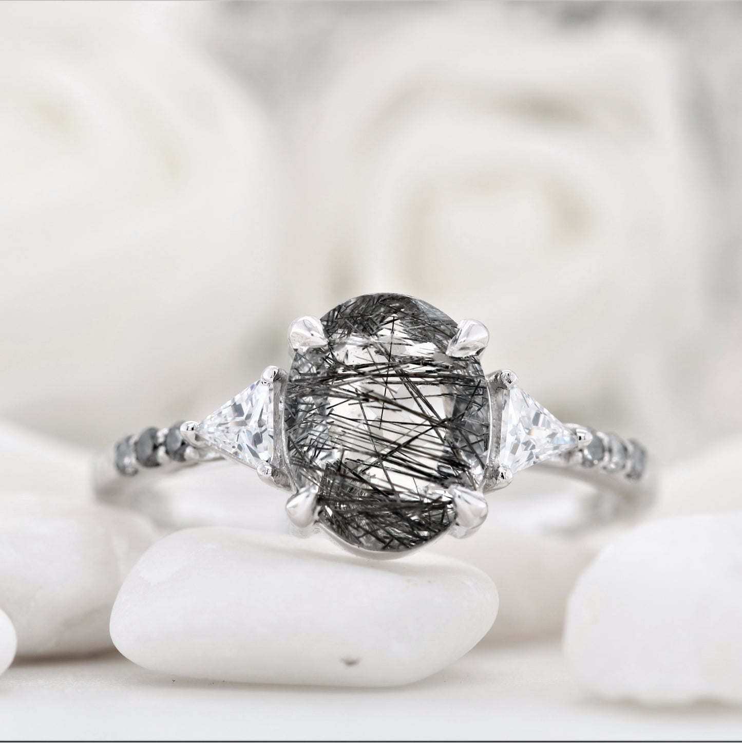 Oval Shape Side Site Three Stone Black Rutilated Quartz Engagement Ring