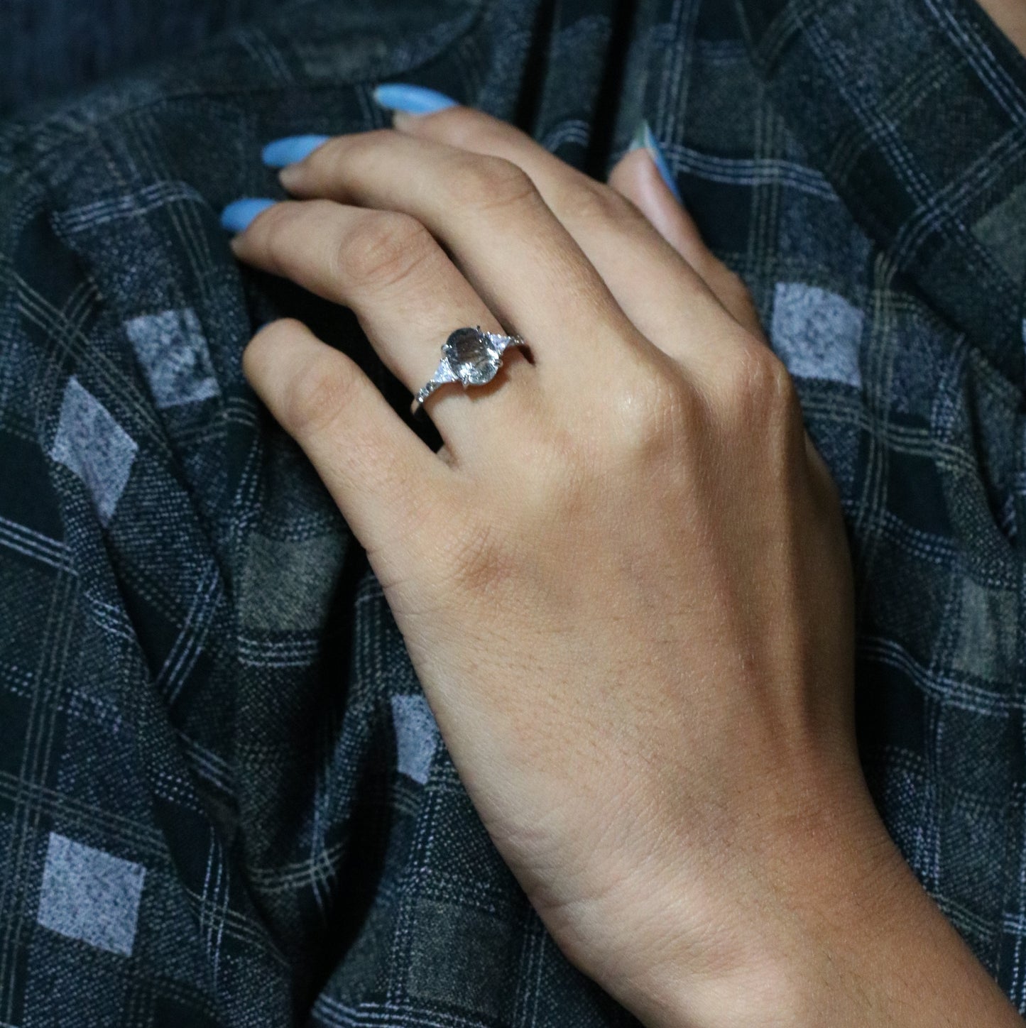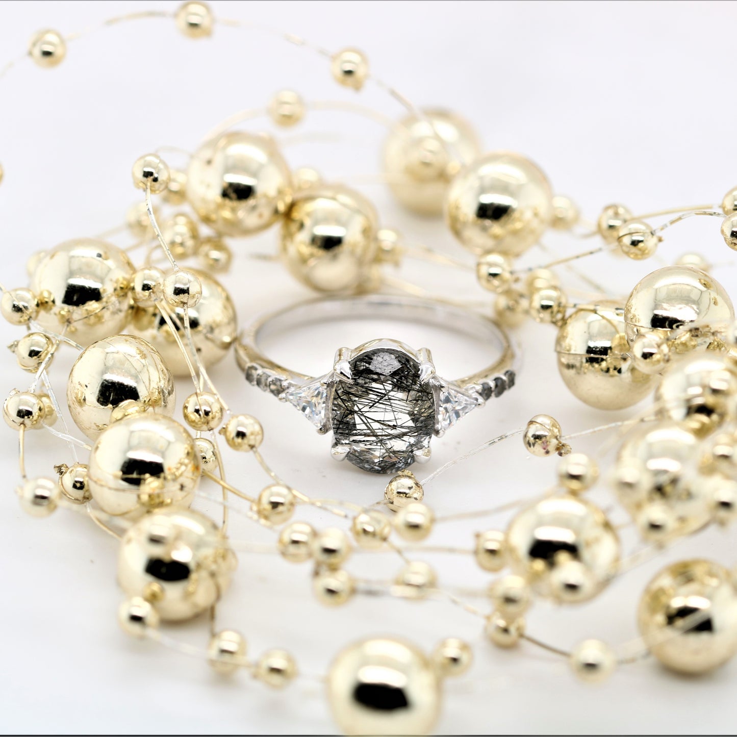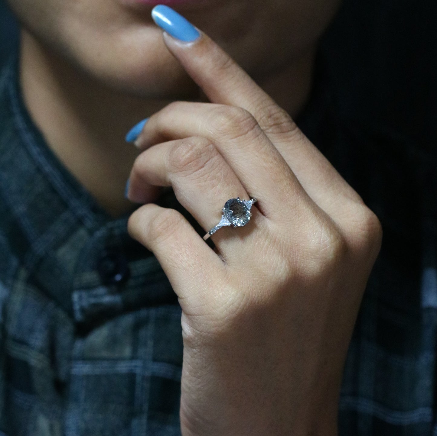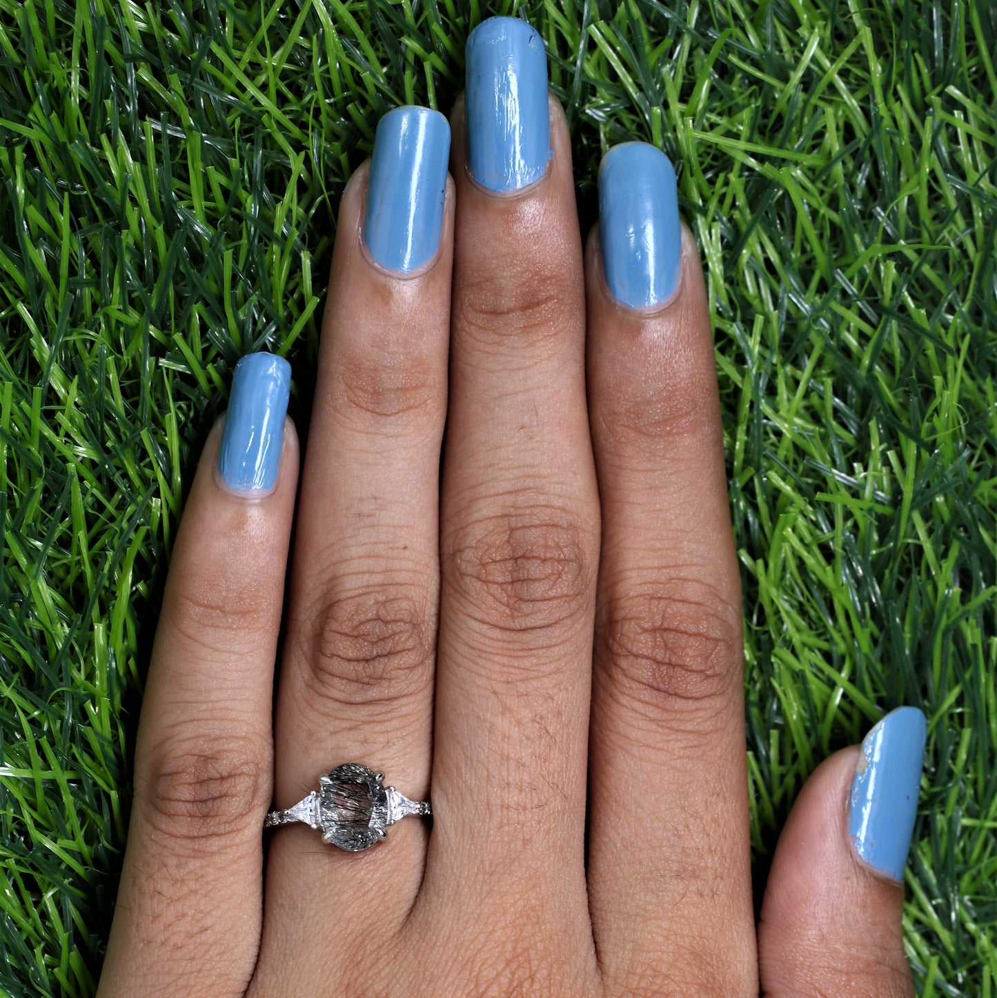 Oval Shape Side Site Three Stone Black Rutilated Quartz Engagement Ring
