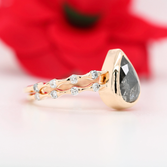 Pear Shape Salt And Pepper Diamond On 14K Yellow Gold Galaxy Diamond Engagement Ring Gift For Her