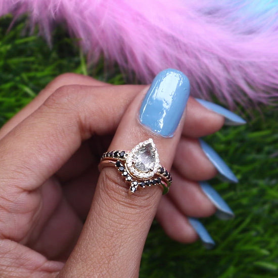 Yellow Gold Pave Band Pear Halo Black Rutilated Quartz Engagement Ring